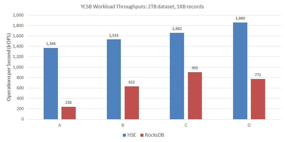 Below are results from running YCSB with HSE. For comparison, we include results from running YCSB with RocksDB, a popular and widely-deployed key-value store.